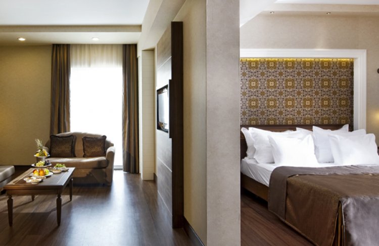 Camere Deluxe Suite (75 mp) - 2 dormitoare (in primul dormitor este un pat matrimonial iarcealalta camera poate fi folosita ca living room); dotate cu: parchet laminat, canale de muzica, TV (LCD) in fiecare camera, telefon (in camera si in baie), seif, aer conditionat (mai-septembrie), minibar (bauturi racoritoare) in fiecare careme, set pentru ceai si cafea, halat, baie (marmura), jacuzzi si dus, uscator de par, oglinda de marire, internet wireless si balcon.