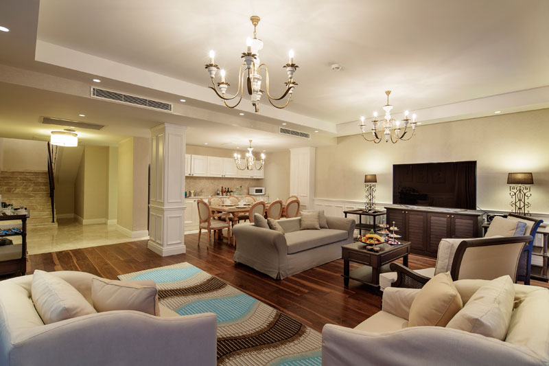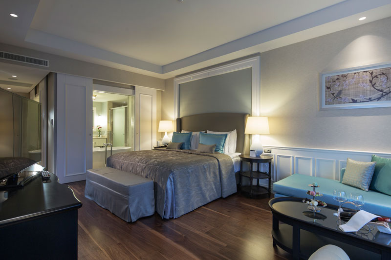 Camerele sunt dotate cu: baie cu dus, foehn, cantar, halat, papuci, aer conditionat centralizat (Main Building, Family Pool Suites), aer conditionat individual (Villas), televizor, telefon, minibar (bauturi racoritoare, bere, chipsuri, lapte - se suplimenteaza zilnic, gratuit), ceainic electric (set de ceai si cafea), seif (gratuit), pardoseala - parchet laminat, balcon, room service (24:00-07:00, gratuit; 07:00-24:00, contra cost) si internet prin cablu (gratuit). Curatenia in camere si schimbarea lenjeriei se face zilnic.