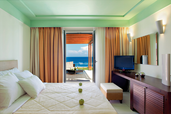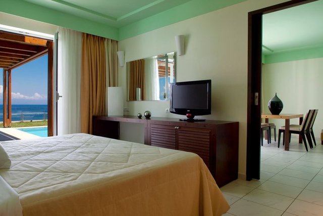 Facilităţi camere: Hotelul dispune de 166 camere mobilate modern şi dotate cu telefon, uscător de păr, TV satelit, mini bar, seif, aer condiţionat şi balcon cu vedere la Marea Ionică sau la uscat. Camerele superior şi suite oferă în plus halate de baie si păpuci